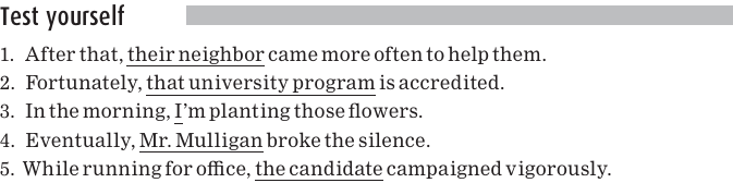 In each of these sentences, the subject is preceded by an adverb or adverbial clause, a group of words typically giving information about time, place, or manner.