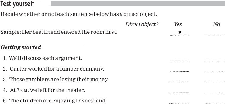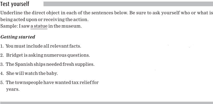 The direct object of a sentence is receiving the action. It can usually be found by answering the question: ‘‘Who or what is being acted upon or receiving the action?’’ The direct object typically occurs immediately after the verb.