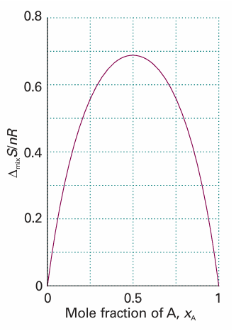 Fig. 5.9 The entropy of mixing of two perfect gases and (as discussed later) of two liquids that form an ideal solution. The entropy increases for all compositions and temperatures, so perfect gases mix spontaneously in all proportions. Because there is no transfer of heat to the surroundings when perfect gases mix, the entropy of the surroundings is unchanged. Hence, the graph also shows the total entropy of the system plus the surroundings when perfect gases mix.