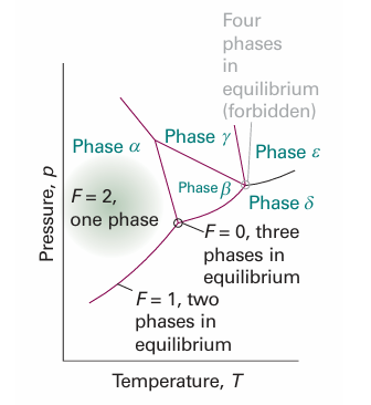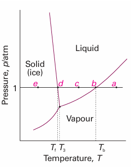 For a one-component system, such as pure water, F = 3 − P. When only one phase is present, F = 2 and both p and T can be varied independently without changing the number of phases. In other words, a single phase is represented by an area on a phase diagram. When two phases are in equilibrium F = 1, which implies that pressure is not freely variable if the temperature is set; indeed, at a given temperature, a liquid has a characteristic vapour pressure. It follows that the equilibrium of two phases is represented by a line in the phase diagram. Instead of selecting the temperature, we could select the pressure, but having done so the two phases would be in equilibrium at a single definite temperature. Therefore, freezing (or any other phase transition) occurs at a definite temperature at a given pressure. When three phases are in equilibrium, F = 0 and the system is invariant. This special condition can be established only at a definite temperature and pressure that is char acteristic of the substance and outside our control. The equilibrium of three phases is therefore represented by a point, the triple point, on a phase diagram. Four phases cannot be in equilibrium in a one-component system because F cannot be negative. These features are summarized in Fig. 6.2. We can identify the features in Fig. 6.2 in the experimentally determined phase diagram for water (Fig. 6.3). This diagram summarizes the changes that take place as a sample, such as that at a, is cooled at constant pressure. The sample remains entirely gaseous until the temperature reaches b, when liquid appears. Two phases are now in equilibrium and F = 1. Because we have decided to specify the pressure, which uses up the single degree of freedom, the temperature at which this equilibrium occurs is not under our control. Lowering the temperature takes the system to c in the one-phase, liquid region. The temperature can now be varied around the point c at will, and only when ice appears at d does the variance become 1 again.