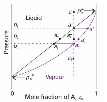 isopleth, from the Greek words for ‘equal abundance’. Until the point a1 is reached (when the pressure has been reduced to p1), the sample consists of a single liquid phase. At a1 the liquid can exist in equilibrium with its vapour. As we have seen, the composition of the vapour phase is given by point a1 ′. A line joining two points representing phases in equilibrium is called a tie line. The composition of the liquid is the same as initially (a1 lies on the isopleth through a), so we have to conclude that at this pressure there is virtually no vapour present; however, the tiny amount of vapour that is present has the composition a1 ′. Now consider the effect of lowering the pressure to p2, so taking the system to a pressure and overall composition represented by the point a2″. This new pressure is below the vapour pressure of the original liquid, so it vaporizes until the vapour pressure of the remaining liquid falls to p2. Now we know that the composition of such a liquid must be a2. Moreover, the composition of the vapour in equilibrium with that liquid must be given by the point a2 ′at the other end of the tie line. Note that two phases are now in equilibrium, so F′=1 for all points between the two lines; hence, for a given pressure (such as at p2) the variance is zero, and the vapour and liquid phases have fixed compositions (Fig. 6.12). If the pressure is reduced to p3, a similar readjustment in composition takes place, and now the compositions of the liquid and vapour are represented by the points a3 and a3 ′, respectively. The latter point corresponds to a system in which the composition of the vapour is the same as the overall composition, so we have to conclude that the amount of liquid present is now virtually zero, but the tiny amount of liquid present has the composition a3. A further decrease in pressure takes the system to the point a4; at this stage, only vapour is present and its composition is the same as the initial overall composition of the system (the composition of the original liquid).