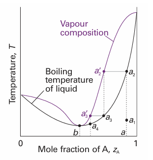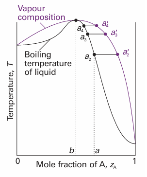 Fig. 6.16 A high-boiling azeotrope. When the liquid of composition a is distilled, the composition of the remaining liquid changes towards b but no further.