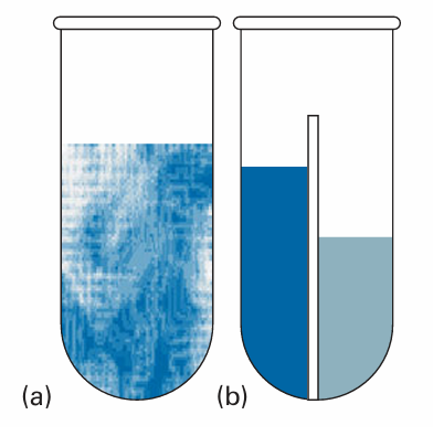 Fig. 6.18 The distillation of (a) two immiscible liquids can be regarded as (b) the joint distillation of the separated components, and boiling occurs when the sum of the partial pressures equals the external pressure.