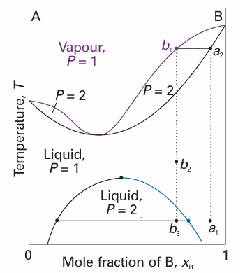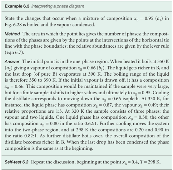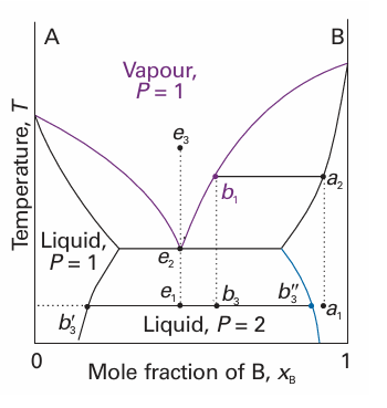 Consider a pair of liquids that are partially miscible and form a low-boiling azeotrope. This combination is quite common because both properties reflect the tendency of the two kinds of molecule to avoid each other. There are two possibilities: one in which the liquids become fully miscible before they boil; the other in which boiling occurs before mixing is complete. Figure 6.26 shows the phase diagram for two components that become fully miscible before they boil. Distillation of a mixture of composition a1leads to a vapour of com positionb1, which condenses to the completely miscible single-phase solution at b2. Phase separation occurs only when this distillate is cooled to a point in the two-phase liquid region, such as b3. This description applies only to the first drop of distillate. If distillation continues, the composition of the remaining liquid changes. In the end, when the whole sample has evaporated and condensed, the composition is back to a1. Figure 6.27 shows the second possibility, in which there is no upper critical solution temperature. The distillate obtained from a liquid initially of composition a1has com positionb3and is a two-phase mixture. One phase has composition b3 ′and the other has composition b3″. The behaviour of a system of composition represented by the isopleth ein Fig. 6.27 is interesting. A system at e1 forms two phases, which persist (but with changing proportions) up to the boiling point at e2. The vapour of this mixture has the same composition as the liquid (the liquid is an azeotrope). Similarly, condensing a vapour of composition e3 gives a two-phase liquid of the same overall composition. At a fixed temperature, the mixture vaporizes and condenses like a single substance.