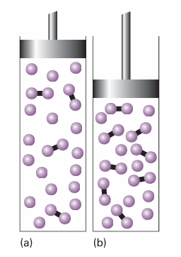 Fig. 7.6 When a reaction at equilibrium is compressed (from a to b), the reaction responds by reducing the number of molecules in the gas phase (in this case by producing the dimers represented by the linked spheres).