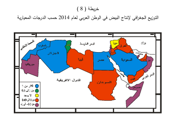 ز- يفيد الأطفال ويعزّز نموهم، فهو يحتوي على البروتينات، والدهون، والكالسيوم، والفيتامينات التي تساعد على النمو السليم؛ لذلك دائماً ينصح الأطباء بتناول البيض واللبن من أجل ضمان النمو السليم لدى الطفل تصدرت الجزائر المرتبة الأولى في إنتاج البيض اذ بلغت كمية إنتاجها ( 303.03 ) الف طن وشكلت نسبة قدرها (16.5%) من الإنتاج العربي وجاءت مصر بالمرتبة الثانية بكمية قدرها ( 292.6 ) الف طن وبنسبة قدرها ( 16 %) من الإنتاج العربي، اما المغرب فقد احتلت المرتبة الثالثة بنسبة قدرها ( %15.2 ) من الإنتاج العربي ، جدول (14) خريطة (8).