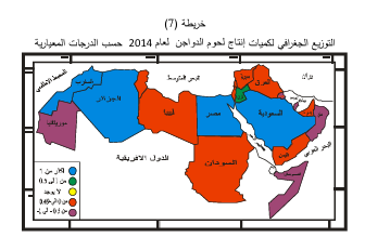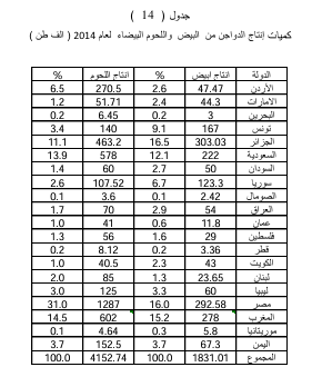 أ - إنتاج لحم الدجاج يعد لحم الدواجن من اللحوم البيضاء ذات الأهمية الغذائية والاقتصادية ويختلف لحومها عن بقية لحوم الثروات الحيوانية الأخرى كما يوضحها الجدول ( 13 ) ، لذا اهتمت كثير من دول العالم في إنتاجها وتربيتها ومنها الدول العربية ، يحتوي لحم الدجاج الأبيض على العناصر الغذائية المهمة التي يحتوي عليها الدجاج الأسمر مع القليل من الاختلافات بينهما، فلحم الدجاج الأسمر فيه كمية أعلى من الحديد إذا تمت مقارنته باللحم الأبيض مع العلم بأن اللحم الأبيض يحتوي على كميه قليلة من الدهون بالنسبة الى لحم الدجاج الأسمر، يحتوي لحم الدجاج على كمية من الدهنيات و بعضها مفيد للصحة، لأنه من النوع غير المشبع ، حيث يجب التخلص من الدهون المشبعة الموجودة في الدجاج عن طريق نزع الجلد منه وعدم إضافة أي نوع من الدهون أو الزيوت عند تحضير الدجاج . ومن خلال ملاحظة الجدول ( 14 ) الذي يوضح إنتاج الدواجن من اللحوم والبيض لعام 2014 ، حيث بلغت كمية إنتاج اللحوم ( 4150.74 ) الف طن وتصدرت مصر المرتبة الأولى بإنتاج قدره (1287) الف طن وشكلت نسبة قدرها ( 31% ) وبدرجة معيارية قدرها (3.44 ) وتليها بالمرتبة الثانية المغرب بنسبة إنتاج قدره ( 14.5%) من الإنتاج العربي وبدرجة معيارية قدرها (126)، في حين احتلت السعودية المرتبة الثالثة بنسبة قدرها ( 13.9 % ) من الإنتاج العربي وبدرجة معيارية قدرها ( 1.17 ) ، انظر جدول ( 14 ) ، خريطة (7).