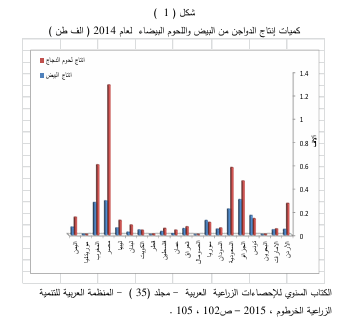 هـ - يجب أن تكون الأدوات المستخدمة للتحصين نظيفة ومعقمة وبعد التطرق الى مميزات تربية الدواجن في الصفحات السابقة والتعرف على أهم الخصائص الجغرافية في الوطن العربي الطبيعية والبشرية نلاحظ ان مناخ الوطن العربي وبيئته الطبيعية تتلاءم مع ظروف تربية الدواجن اذا ما وفرت لها السياسة الحكومية من ارصدة مالية تدفع الى مربي الدواجن من اجل رفد الإنتاج الحيواني من منتجاتها المتمثلة باللحوم البيضاء والبيض والتي ارتفعت كميات إنتاجه خلال السنوات الأخيرة وقد سدت الحاجة المحلية لكثير من دول الوطن العربي وكما توضحه بيانات الشكل ( 1 ) ، ومنه نلاحظ بان الإنتاج العربي من لحوم الدواجن والبيض بلغ في عام 2014 حوالي (4150.8) الف طن من لحوم الدواجن و (1831.01) الف طن من البيض ، ويعود ازدهار تربية الدواجن في هذه البلدان الى اهمية لحوم وبيض الدواجن في سد الفجوة الغذائية بدلاً عن اللحوم الحمراء من حيث الأهمية الغذائية ، والدراسة منتجات الدواجن في الوطن العربي من خلال الآتي : -