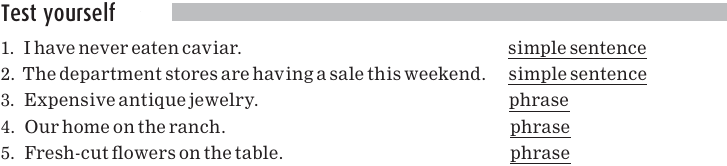 None of these contains both a subject and a verb phrase, and so these are not sentences at all; they’re just phrases. You may recognize sentence 7 as a preposition phrase, sentence 8 as a noun phrase, and sentence 9 as a verb phrase.
