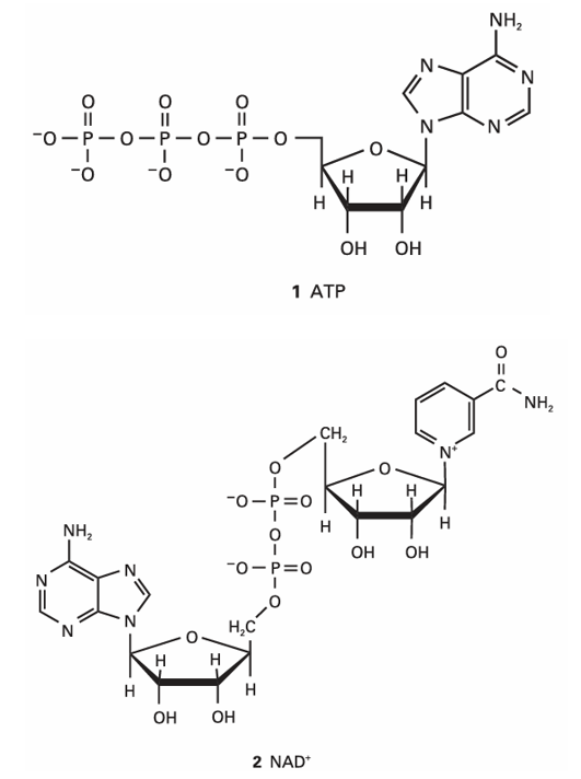 The whole of life’s activities depends on the coupling of exergonic and endergonic re actions, for the oxidation of food drives other reactions forward. In biological cells, the energy released by the oxidation of foods is stored in adenosine triphosphate (ATP, 1). The essence of the action of ATP is its ability to lose its terminal phosphate group by hydrolysis and to form adenosine diphosphate (ADP):