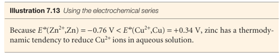 Table 7.3 shows a part of the electrochemical series, the metallic elements (and hydrogen) arranged in the order of their reducing power as measured by their stand ard potentials in aqueous solution. A metal low in the series (with a lower standard potential) can reduce the ions of metals with higher standard potentials. This conclusion is qualitative. The quantitative value of Kis obtained by doing the calculations we have described previously. For example, to determine whether zinc can displace magnesium from aqueous solutions at 298 K, we note that zinc lies above magnesium in the electrochemical series, so zinc cannot reduce magnesium ions in aqueous solution. Zinc can reduce hydrogen ions, because hydrogen lies higher in the series. However, even for reactions that are thermodynamically favourable, there may be kinetic factors that result in very slow rates of reaction. The reactions of the electron transport chains of respiration are good applications of this principle.