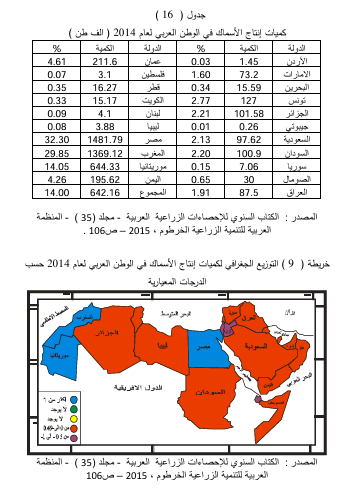 و- عزوف كثير من سكان السواحل العربية في جهات متعددة من الوطن العربي عن احتراف الصيد وعدم إقبال قطاعات عريضة منهم على تناول الأسماك رغم غناها بالبروتينات وانخفاض أسعارها بالقياس إلى أسعار اللحوم الحمراء والدواجن ومن خلال الاطلاع على مميزات الثروة السمكية في الوطن العربي وطرق وأماكن الصيد في السواحل والانهار والمسطحات المائية ، فقد بلغ إنتاجها في عام 2014 من الأسماك البحرية (3368) الف طن والنهرية (1219.4) الف طن كما موضحة في الجدول (16) وملحق (2) ، ومنه يتضح بان مصر تصدرت المرتبة الأولى بإنتاج الأسماك لعام 2014 حيث بلغ كمية إنتاجها (1481.79) الف طن وشكل نسبة قدرها 32.3%) من الإنتاج العربي للأسماك وبدرجة معيارية قدرها (2.97) ، في حين احتلت المغرب وموريتانيا المرتبتين الثانية والثالثة بإنتاج قدره (1369.12 ، 644.33) الف طن وشكلت نسبة قدرها (29.85 ، 14.05%) من الإنتاج العربي وبدرجة معيارية قدرها (2.7 ، 1) على التوالي ، ويعود هذا الإنتاج الكبير الى وقوع الدول العربية الثلاثة على سواحل بحرية طويلة تمثلت في المحيط الأطلسي والبحر المتوسط بالإضافة توفر مصادر المياه السطحية (الأنهار والبحيرات) وخاصة في مصر.