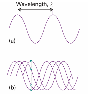 Fig. 8.1 The wavelength, λ, of a wave is the peak-to-peak distance. (b) The wave is shown travelling to the right at a speed c. At a given location, the instantaneous amplitude of the wave changes through a complete cycle (the four dots show half a cycle). The frequency, ν, is the number of cycles per second that occur at a given point.