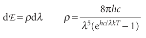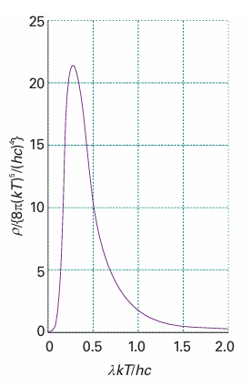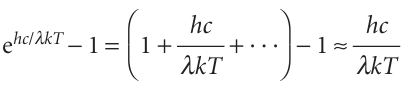 The Planck distribution resembles the Rayleigh–Jeans law (eqn 8.3) apart from the all-important exponential factor in the denominator. For short wavelengths, hc/λkT >> 1 and ehc/λkT →∞faster than λ5→0; therefore ρ →0 as λ→0 or ν→∞. Hence, the energy density approaches zero at high frequencies, in agreement with observation. For long wavelengths, hc/λkT << 1, and the denominator in the Planck distribution can be replaced by