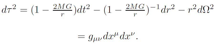 The coordinate t is called Schwarzschild time, and it represents the time recorded by a standard clock at rest at spatial infinity. The coordinate r is called the Schwarzschild radial coordinate. It does not measure proper spatial distance from the origin, but is defined so that the area of the 2- sphere at r is 4πr2.The angles θ, φ are the usual polar and azimuthal angles. In equation 1.1 we have chosen units such that the speed of light is 1.