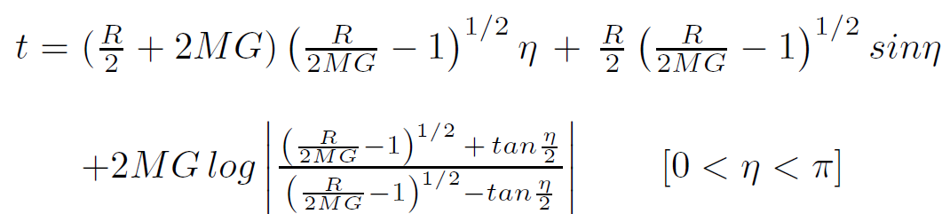 To determine whether the local geometry is singular at r = 2MGwe can send an explorer in from far away to chart it. For simplicity let's consider a radially freely falling observer who is dropped from rest from the point r = R. The trajectory of the observer in parametric form is given by