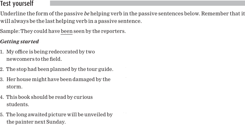 You may recognize this special form of the verb as the past participle form of the verb, the same form of the verb that follows the helping verb have. That is, just as each of the other helping verbs has an effect on the verb following it, the passive be also has an effect on the verb following it: the verb must be in its past participle form.