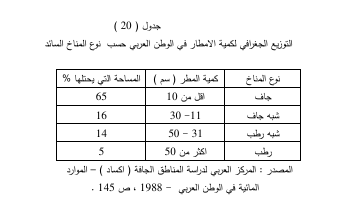 يقل متوسط نصيب الفرد من الموارد المائية على مستوي الوطن العربي عن خط الفقر المائي المحدد عالميا بنحو 1000 متر مكعب سنويا، ومع ذلك فإنه يزيد عنه في عدد قليل من الدول العربية وهي سوريا والعراق ولبنان والصومال والمغرب وموريتانيا ويقل عن 500 متر مكعب في دول كالأردن وفلسطين وجيبوتي وتونس ودول شبه الجزيرة العربية باستثناء سلطنة عمان، ويتراوح بين 500 ـ 1000 متر مكعب في بقية الدول العربية ، وتشير الدراسات على أن نصيب الفرد العربي من المياه على وجه العموم، يعتبر أدنى نصيب للفرد في العالم، حيث تراجع من (3300م) سنوياً، في عام 1960 إلى 1250 م 3 سنوياً في عام 2000، ومن المتوقع أن يصل في عام 2030 إلى أقل من (600 م) سنوياً، بسبب تزايد السكان العرب في الدول المتشاطئة مع دول الجوار، أو التي تخترقها الأنهار من الجوار الإقليمي وتعاني الدول العربية من قلة المياه منذ عام 1970 وسوف تستمر في السنوات المقبلة وذلك لأسباب كثيرة في مقدمتها جفاف المناخ اذ تقع حوالي 95% من الاراضي العربية في مناطق جافة او شبه جافة كما يوضحها الجدول ( 20 ) ، بالإضافة الى تحكم بعض دول الجوار بكميات المياه الداخلة الى حدود الوطن العربي بالإضافة الى سوء استخدام المياه وخاصة في مجال الري الزراعي وجهل المزارع العربي بالتقنيات الحديثة في مجال الزراعة والري والتسميد وغيرها من العمليات الزراعية المتعلقة بالمياه العربية مما خلق ما يسمى بالأزمة المائية وتعرف الأزمة المائية بأنها خلل في التوازن بين الموارد المائية المتجددة والمتاحة والطلب المتزايد عليها والذي يتمثل بظهور عجز في الميزان المائي يتزايد باستمرار ويؤدي إلى إعاقة التنمية وهذا العجز هو الحالة التي يفوق حجم الاحتياجات المائية فيها كمية الموارد المائية المتجددة والمتاحة.