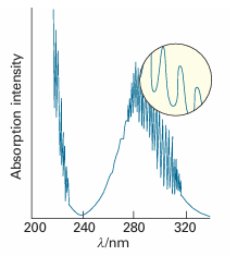 Fig. 8.11 When a molecule changes its state, it does so by absorbing radiation at definite frequencies. This spectrum is part of that due to the electronic, vibrational, and rotational excitation of sulfur dioxide (SO2) molecules. This observation suggests that molecules can possess only discrete energies, not an arbitrary energy.