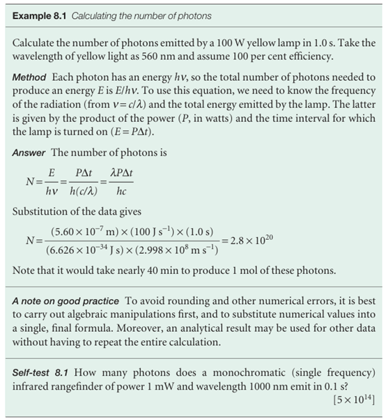 Figure 8.13 illustrates the first and second characteristics. These observations strongly suggest that the photoelectric effect depends on the ejection of an electron when it is involved in a collision with a particle-like projectile that carries enough energy to eject the electron from the metal. If we suppose that the projectile is a photon of energy hν, where ν is the frequency of the radiation, then the conservation of energy requires that the kinetic energy of the ejected electron should obey , 1/2 mev2 =hν−Φ , In this expression Φ is a characteristic of the metal called its work function, the energy required to remove an electron from the metal to infinity (Fig. 8.14), the analogue of the ionization energy of an individual atom or molecule. Photoejection cannot occur if hν < Φ because the photon brings insufficient energy: this conclusion accounts for observation (1). Equation 8.11 predicts that the kinetic energy of an ejected electron should increase linearly with frequency, in agreement with observation (2). When a photon collides with an electron, it gives up all its energy, so we should expect electrons to appear as soon as the collisions begin, provided the photons have sufficient energy; this conclusion agrees with observation (3). A practical application of eqn 8.11 is that it provides a technique for the determination of Planck’s constant, for the slopes of the lines in Fig. 8.13 are all equal to h.