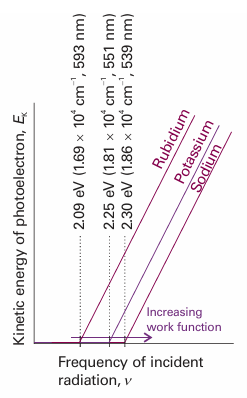 Fig. 8.13 In the photoelectric effect, it is found that no electrons are ejected when the incident radiation has a frequency below a value characteristic of the metal and, above that value, the kinetic energy of the photoelectrons varies linearly with the frequency of the incident radiation.