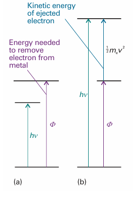 Fig. 8.14 The photoelectric effect can be explained if it is supposed that the incident radiation is composed of photons that have energy proportional to the frequency of the radiation. (a) The energy of the photon is insufficient to drive an electron out of the metal. (b) The energy of the photon is more than enough to eject an electron, and the excess energy is carried away as the kinetic energy of the photoelectron (the ejected electron).