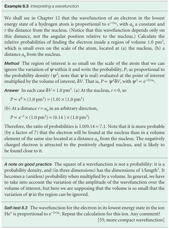 A principal tenet of quantum mechanics is that the wavefunction contains all the dynamical information about the system it describes. Here we concentrate on the information it carries about the location of the particle. The interpretation of the wavefunction in terms of the location of the particle is based on a suggestion made by Max Born. He made use of an analogy with the wave theory of light, in which the square of the amplitude of an electromagnetic wave in a region is interpreted as its intensity and therefore (in quantum terms) as a measure of the probability of finding a photon present in the region. The Born interpretation of the wavefunction focuses on the square of the wavefunction (or the square modulus, |ψ|2 = ψ*ψ, if ψ is complex). It states that the value of |ψ|2 at a point is proportional to the probability of finding the particle in a region around that point. Specifically, for a one-dimensional system (Fig. 8.19): If the wavefunction of a particle has the value ψ at some point x, then the prob ability of finding the particle between x and x + dx is proportional to |ψ|2dx. Thus, |ψ|2 is the probability density, and to obtain the probability it must be multi plied by the length of the infinitesimal region dx. The wavefunction ψ itself is called the probability amplitude. For a particle free to move in three dimensions (for example, an electron near a nucleus in an atom), the wavefunction depends on the point dr with coordinates x, y, and z, and the interpretation of ψ(r) is as follows (Fig. 8.20): If the wavefunction of a particle has the value ψ at some point r, then the prob ability of finding the particle in an infinitesimal volume dτ = dxdydz at that point is proportional to |ψ2 dτ. The Born interpretation does away with any worry about the significance of a negative (and, in general, complex) value of ψ because |ψ|2 is real and never negative. There is no direct significance in the negative (or complex) value of a wavefunction: only the square modulus, a positive quantity, is directly physically significant, and both negative and positive regions of a wavefunction may correspond to a high probability of finding a particle in a region (Fig. 8.21). However, later we shall see that the presence of positive and negative regions of a wavefunction is of great indirect significance, because it gives rise to the possibility of constructive and destructive interference between different wavefunctions.