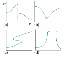 Fig. 8.24 The wavefunction must satisfy stringent conditions for it to be acceptable. (a) Unacceptable because it is not continuous; (b) unacceptable because its slope is discontinuous; (c) unacceptable because it is not single-valued; (d) unacceptable because it is infinite over a finite region.
