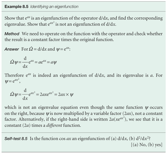 (Operator)(function) = (constant factor) × (same function) , If we denote a general operator by) (where Ω is uppercase omega) and a constant factor by ω (lowercase omega), then an eigenvalue equation has the form , Ω ψ=ωψ , The factor ω is called the eigenvalue of the operator Ω. The eigenvalue in eqn 8.24a is the energy. The function ψ in an equation of this kind is called an eigenfunction of the operator Ω and is different for each eigenvalue. The eigenfunction in eqn 8.24a is the wavefunction corresponding to the energy E. It follows that another way of saying ‘solve the Schrödinger equation’ is to say ‘find the eigenvalues and eigen functions of the hamiltonian operator for the system’. The wavefunctions are the eigenfunctions of the hamiltonian operator, and the corresponding eigenvalues are the allowed energies.