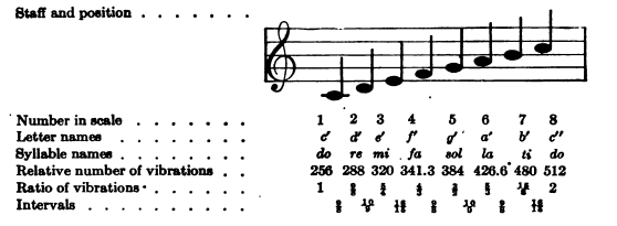 The scale given in § fig 1 is the major scale formed upon the major triad or major chord. This chord consists of any three tones, the numbers of whose vibrations per second are in the proportion of 4, 5, 6. There are three major chords, as follows