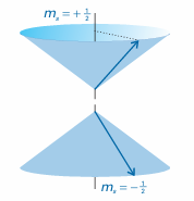 Fig. 9.41 An electron spin (s = 1/2) can take only two orientations with respect to a specified axis. An α electron (top) is an electron with ms =+1/2; a β electron (bottom) is an electron with ms=-1/2 The vector representing the spin angular momentum lies at an angle of 55° to the z-axis (more precisely, the half-angle of the cones is arccos (1/3 1/2)).
