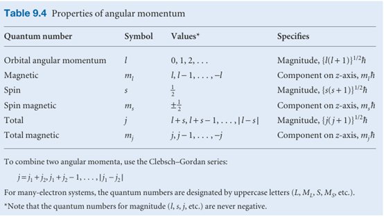 One orientation corresponds to ms =+1/2 (this state is often denoted α or ↑); the other orientation corresponds to ms =−1/2 (this state is denoted β or ↓). The outcome of the Stern–Gerlach experiment can now be explained if we suppose that each Ag atom possesses an angular momentum due to the spin of a single electron, because the two bands of atoms then correspond to the two spin orientations. Why the atoms behave like this is explained in Chapter 10 (but it is already probably familiar from introductory chemistry that the ground-state configuration of a silver atom is [Kr]4d105s1, a single unpaired electron outside a closed shell). Like the electron, other elementary particles have characteristic spin. For example, protons and neutrons are spin-1/2 particles (that is, s = 1/2) and invariably spin with angular momentum (3/4)1/2h = 0.866$. Because the masses of a proton and a neutron are so much greater than the mass of an electron, yet they all have the same spin angular momentum, the classical picture would be of these two particles spinning much more slowly than an electron. Some elementary particles have s = 1, and so have an intrinsic angular momentum of magnitude 2 1/2h. Some mesons are spin-1 particles (as are some atomic nuclei), but for our purposes the most important spin-1 particle is the photon. From the discussion in this chapter, we see that the photon has zero rest mass, zero charge, an energy hν, a linear momentum h/λ or hν/c, an intrinsic angular momentum of 2 1/2h, and travels at the speed c. We shall see the importance of photon spin in the next chapter. Particles with half-integral spin are called fermions and those with integral spin (including 0) are called bosons. Thus, electrons and protons are fermions and pho tons are bosons. It is a very deep feature of nature that all the elementary particles that constitute matter are fermions whereas the elementary particles that are responsible for the forces that bind fermions together are all bosons. Photons, for example, transmit the electromagnetic force that binds together electrically charged particles. Matter, therefore, is an assembly of fermions held together by forces conveyed by bosons. The properties of angular momentum that we have developed are set out in Table 9.4. As mentioned there, when we use the quantum numbers l and ml we shall mean orbital angular momentum (circulation in space). When we use s and ms we shall mean spin angular momentum (intrinsic angular momentum). When we use j and mj we shall mean either (or, in some contexts to be described in Chapter 10, a combination of orbital and spin momenta).