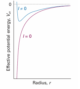 Fig. 10.2 The effective potential energy of an electron in the hydrogen atom. When the electron has zero orbital angular momentum, the effective potential energy is the Coulombic potential energy. When the electron has nonzero orbital angular momentum, the centrifugal effect gives rise to a positive contribution that is very large close to the nucleus. We can expect the l = 0 and l ≠0 wavefunctions to be very different near the nucleus.