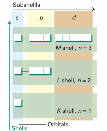Fig. 10.8 The organization of orbitals (white squares) into subshells (characterized by l) and shells (characterized by n).