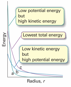 Fig. 10.9 The balance of kinetic and potential energies that accounts for the structure of the ground state of hydrogen (and similar atoms). (a) The sharply curved but localized orbital has high mean kinetic energy, but low mean potential energy; (b) the mean kinetic energy is low, but the potential energy is not very favourable; (c) the compromise of moderate kinetic energy and moderately favourable potential energy.