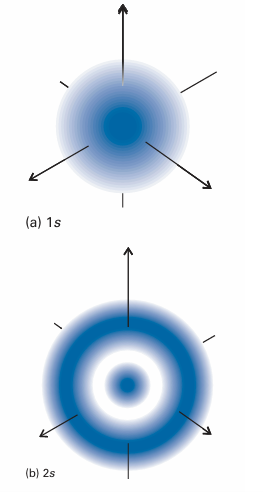 Fig. 10.10 Representations of the 1s and 2s hydrogenic atomic orbitals in terms of their electron densities (as represented by the density of shading)