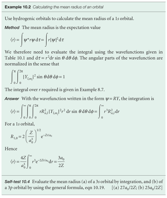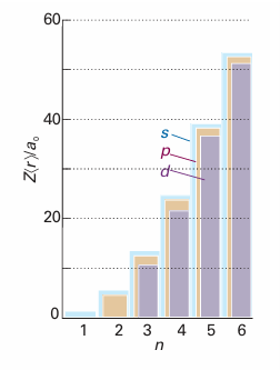The variation with n and l is shown in Fig. 10.12. Note that, for a given principal quantum number, the mean radius decreases as l increases, so the average distance of an electron from the nucleus is less when it is in a 2porbital, for instance, than when it is in a 2sorbital.