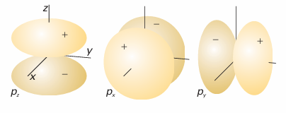 Fig. 10.15The boundary surfaces of porbitals. A nodal plane passes through the nucleus and separates the two lobes of each orbital. The dark and light areas denote regions of opposite sign of the wavefunction