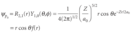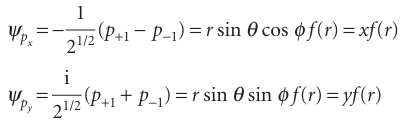 These linear combinations are indeed standing waves with no net orbital angular momentum around the z-axis, as they are superpositions of states with equal and opposite values of ml. The pxorbital has the same shape as a pzorbital, but it is directed along the x-axis (see Fig. 10.15); the py orbital is similarly directed along the y-axis. The wavefunction of any p orbital of a given shell can be written as a product of x, y, or z and the same radial function (which depends on the value of n).