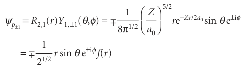 All p orbitals with ml=0 have wavefunctions of this form regardless of the value of n. This way of writing the orbital is the origin of the name ‘pz orbital’: its boundary sur face is shown in Fig. 10.15. The wavefunction is zero everywhere in the xy-plane, where z=0, so the xy-plane is a nodal plane of the orbital: the wavefunction changes sign on going from one side of the plane to the other. The wavefunctions of 2porbitals with ml=±1 have the following form: