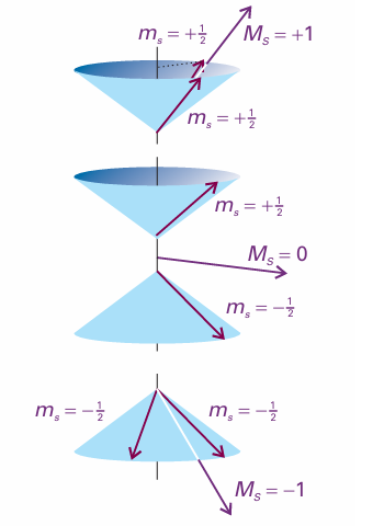 Fig. 10.24 When two electrons have parallel spins, they have a nonzero total spin angular momentum. There are three ways of achieving this resultant, which are shown by these vector representations. Note that, although we cannot know the orientation of the spin vectors on the cones, the angle between the vectors is the same in all three cases, for all three arrangements have the same total spin angular momentum (that is, the resultant of the two vectors has the same length in each case, but points in different directions). Compare this diagram with Fig. 10.18, which shows the antiparallel case. Note that, whereas two paired spins are precisely antiparallel, two ‘parallel’ spins are not strictly parallel.