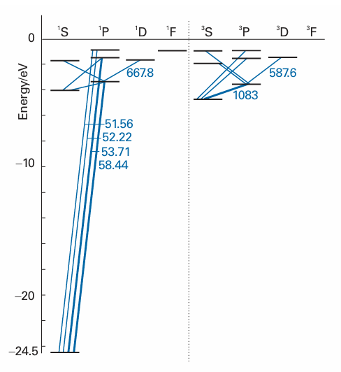 Fig. 10.25 Part of the Grotrian diagram for a helium atom. Note that there are no transitions between the singlet and triplet levels.