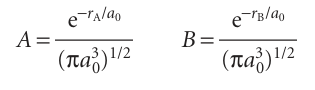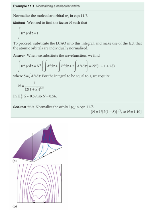 where, for H2+, A denotes χH1sA , B denotes χH1sB , and N is a normalization factor. The technical term for the superposition in eqn 11.7 is a linear combination of atomic orbitals (LCAO). An approximate molecular orbital formed from a linear combination of atomic orbitals is called an LCAO-MO. A molecular orbital that has cylindrical symmetry around the internuclear axis, such as the one we are discussing, is called a σ orbital because it resembles an s orbital when viewed along the axis and, more precisely, because it has zero orbital angular momentum around the internuclear axis.