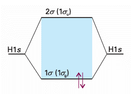 Fig. 11.23 A molecular orbital energy level diagram for orbitals constructed from the overlap of H1s orbitals; the separation of the levels corresponds to that found at the equilibrium bond length. The ground electronic configuration of H2 is obtained by accommodating the two electrons in the lowest available orbital (the bonding orbital).