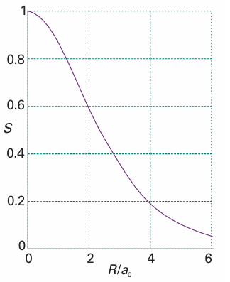 Fig. 11.29 The overlap integral, S, between two H1s orbitals as a function of their separation R.