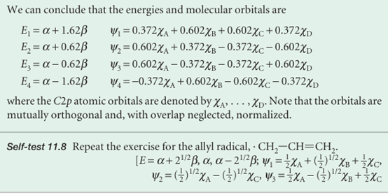 In the Hückel approximation, HAA=HBB=α,HAB=HBA=β, and we neglect overlap, setting S=1, the unit matrix (with 1 on the diagonal and 0 elsewhere). Then