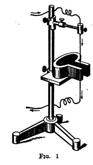 Demonstration. - Support a horseshoe magnet having a strong magnetic field in a horizontal position as shown in Fig. 1. Send a current through a No. 30 copper wire that is hanging vertically between the poles. As soon as the current is turned on, the wire will move out from between the poles, and if the current is strong enough, it will swing around to the outside of the N pole. The reason for the motion of the wire is seen if we apply the law of the mutual action of magnetic lines of force to the magnetic field around the wire when it is between the poles of the magnet. Let Fig. 2 represent a horizontal section through the wire and magnet.