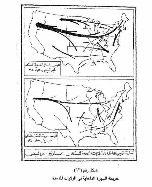 (جـ) هجرة الزنوج من الجنوب: وهى هجرة تتجه غالبا إلى الولايات الشمالية وإن كانت تتجه أحيانا إلى الولايات الغربية ، ويرجع السبب الرئيسي في ذلك إلى أن الولايات الجنوبية ، حتى بعد تحرير الرقيق ، ظلت تمارس تفرقة عنصرية ضد الزنوج ، وكانت الولايات الشمالية أكثر تسامحا وأكبر فرصا وأكثر حاجة إلى عمال من الزنوج ، وقد بدأت هجرات الزنوج من الجنوب في عام 1915 مما أدى إلى تغيير فى توزيعهم فبعد أن كان الزنوج في الشمال والغرب في عام 1910 يمثلون 10% من جملة الزنوج أصبحوا 24% في عام 1940 وازدادوا إلى 40% في عام 1960، وكانت الولايات الجنوبية تقاوم خروج الزنوج منها بفرض الغرامة والسجن على من يشجع الأفراد العاملين على مغادرة هذه الولايات وقد حدث ذلك فى الأباما وفلوريدا وجورجيا ومسيسبى ، ومع ذلك استمر الزنوج في هجرتهم من الجنوب.