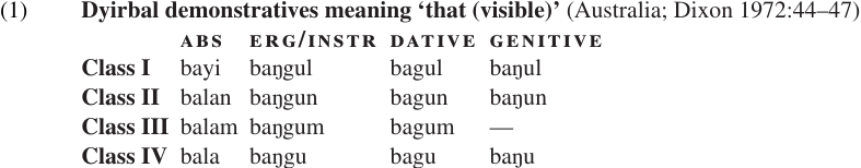 As we saw, Portuguese distinguishes only two grammatical genders, masculine and feminine. German, Russian, and a number of other European languages distinguish three grammatical genders (masculine, feminine, and neuter). Dyirbal has four genders. The gender of the head noun is indicated by a determiner that also indicates the case of the NP and its proximity to the speaker (‘here,’ ‘there but visible,’ or ‘there and not visible’). The various case and gender forms of the marker that signals ‘there but visible’ are listed in (1).