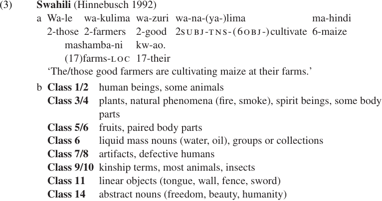 Bantu languages are famous for their noun class systems, which involve not only agreement between nouns and their modifiers but also verbal agreement with subjects and (optionally) direct objects. The pattern is illustrated with a Swahili sentence in (3a). The agreement prefixes signal both noun class and number: class 2 is the plural form of class 1; class 6 the plural form of class 5, etc. Semantic correlates for some of these classes are listed in (3b).